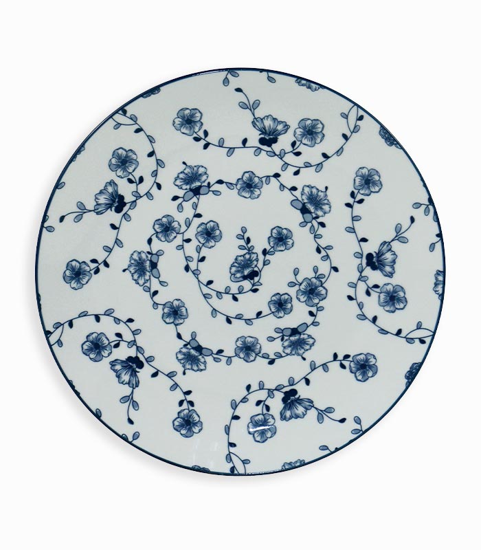 Assiette ronde en porcelaine, coloris banc avec fleurs bleues.