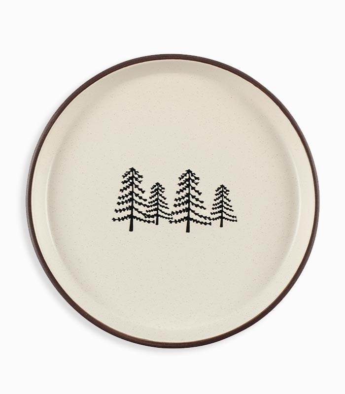 Assiette ronde en faïence écru, avec motif 4 sapins noirs dans le centre de l’assiette, bord avec liseré chocolat.