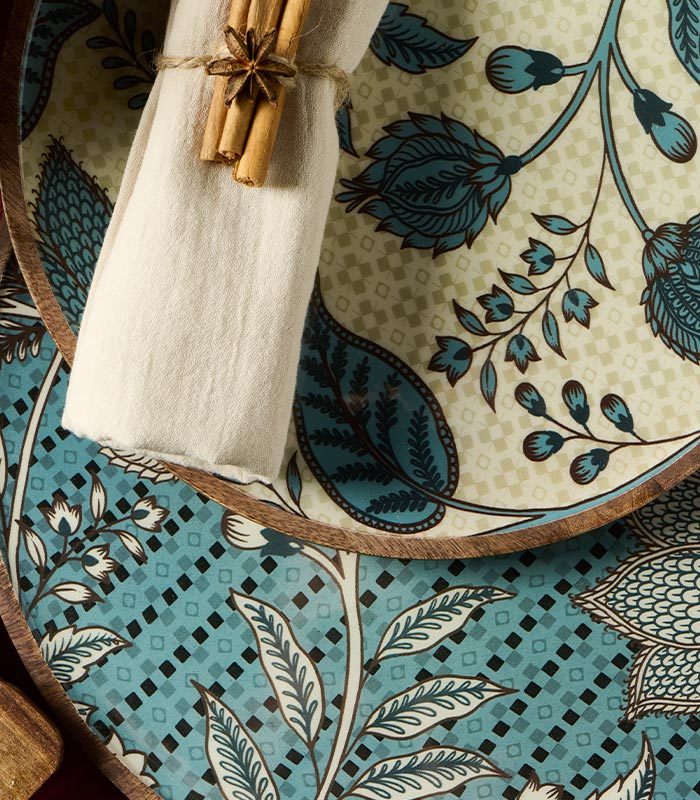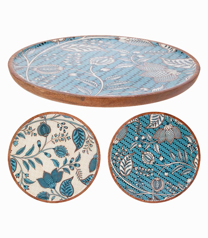 Assiette plate en bois de manguier avec motifs floraux bleus.