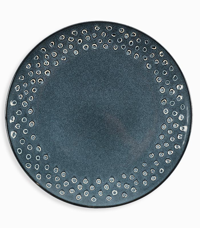 Assiette ronde en faïence, coloris gris avec motifs petits ronds blancs.