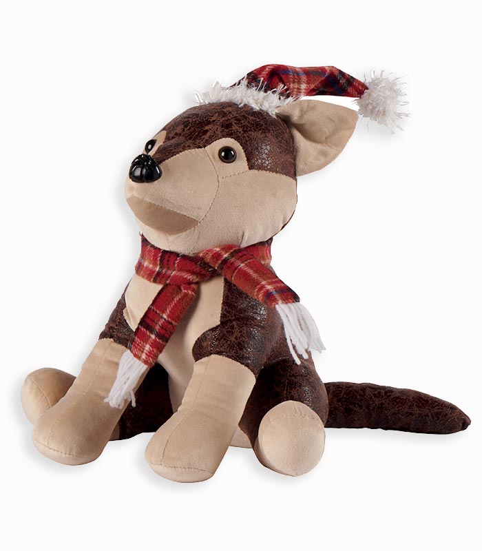 Bloque-porte renard avec bonnet à carreaux rouges et écharpe assortie