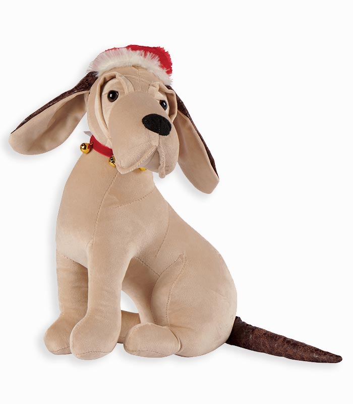 Bloque-porte en velours écru avec bonnet de Noel rouge et collier rouge 3 grelots dorés 100% polyester, oreilles et queue 100% PU, rembourrage polyester et sable
