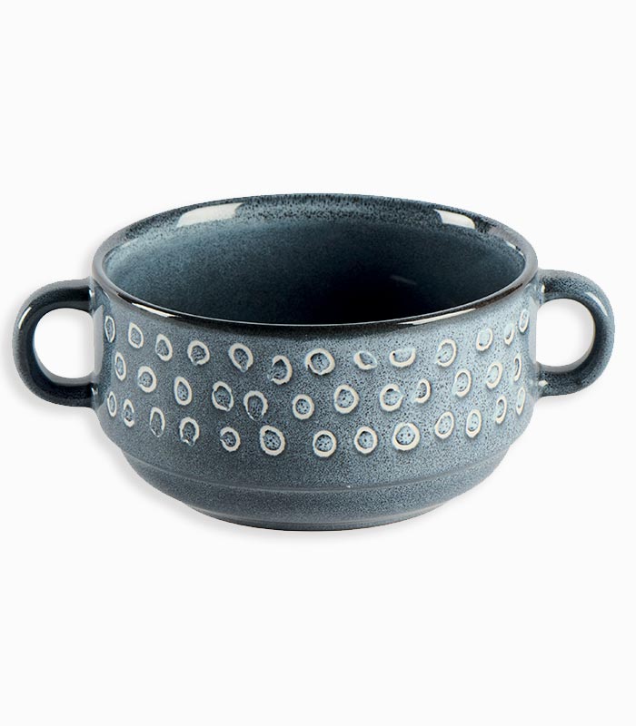 bol en faïence, coloris gris avec motifs petits ronds blancs.