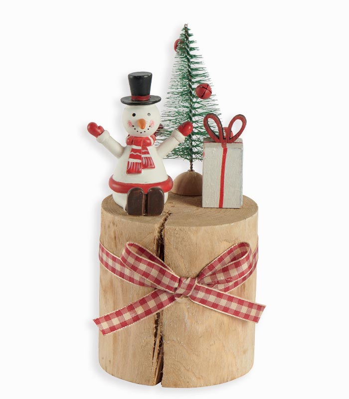 Bonhomme de neige avec sapin et cadeau à noeud vichy rouge sur rondin de bois
