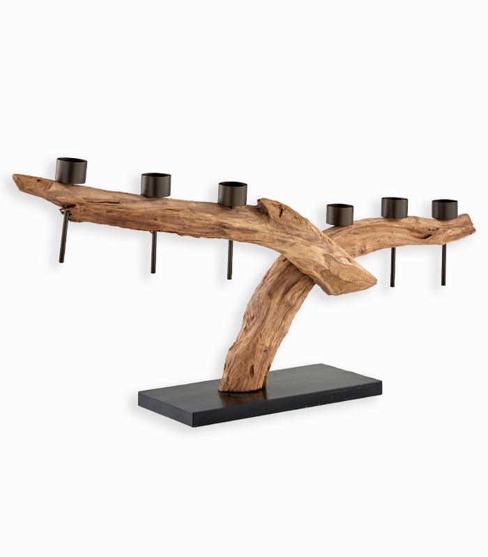 Bougeoir 6 bougies en teck recyclé finition naturelle et métal noir