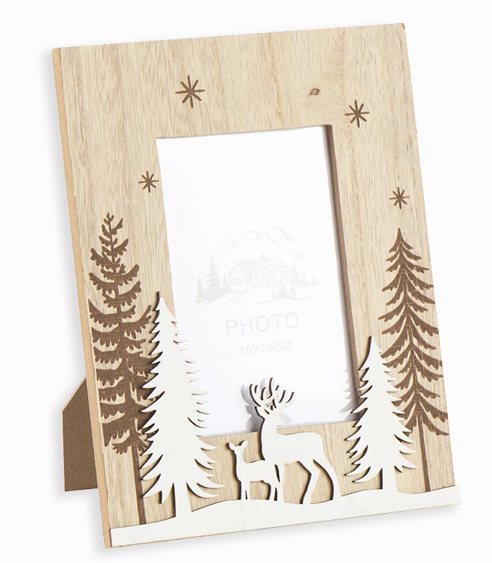 Cadre photo à poser en bois naturel gravé de sapins, décor en relief blanc sapins et cerfs