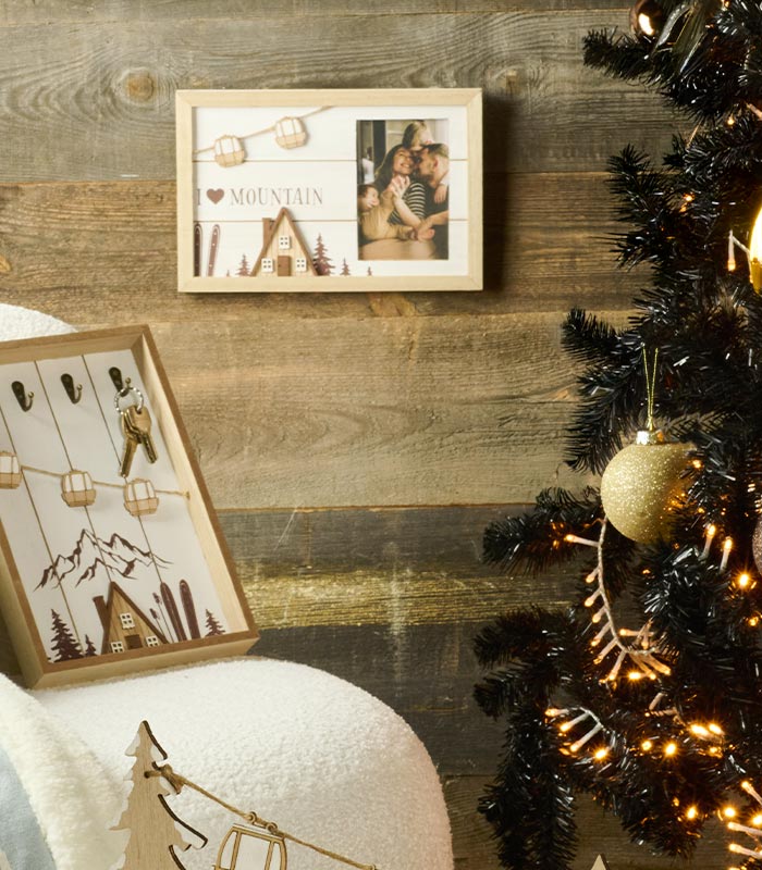 Cadre photo en bois blanc, déco chalet et télécabines avec inscription « I love Moutain ».