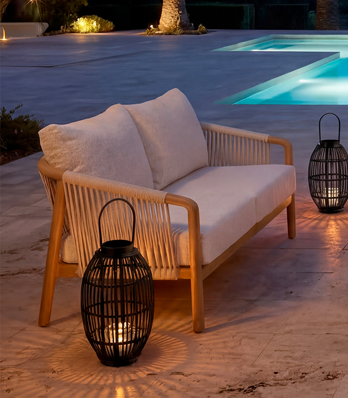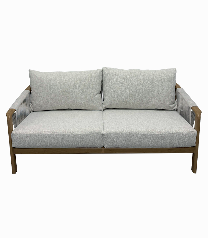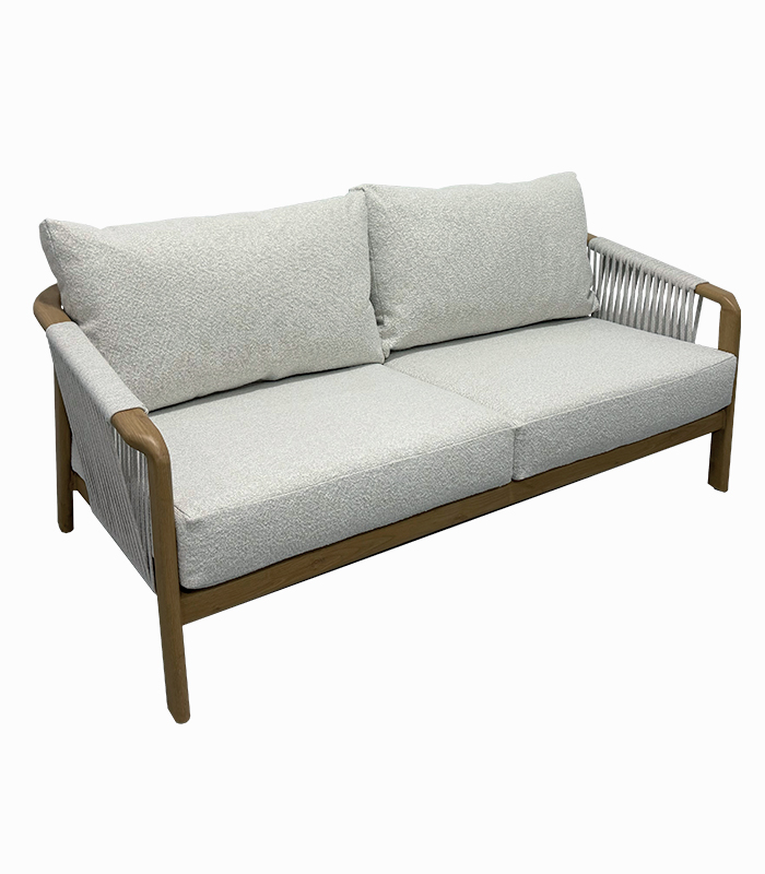 Canapé d’extérieur avec accoudoirs en alu imitation bois, assise et dossier en olifen blanc.