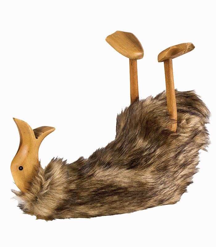 Canard en bois et fourrure synthétique pour poser une bouteille.