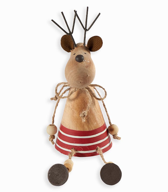 Cerf à poser en bois naturel et rouge pattes en cordes et perles, cornes en métal