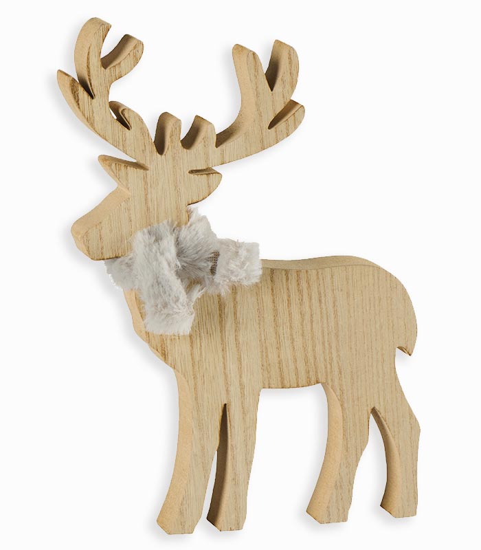 Cerf décoratif en bois clair à poser avec écharpe fourrure synthétique grise