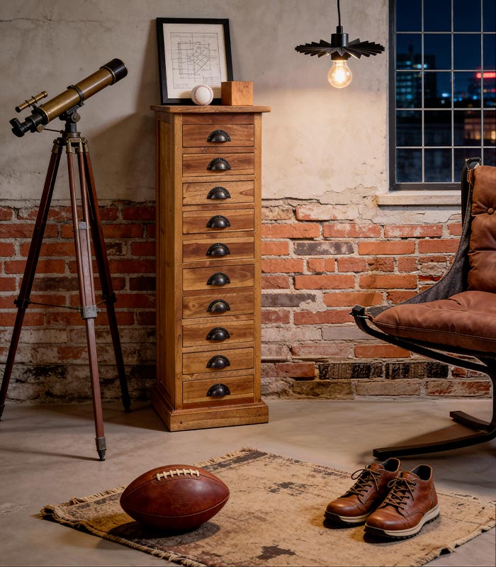 Un meuble en bois de teck doté de 10 tiroirs avec poignées apothicaire.