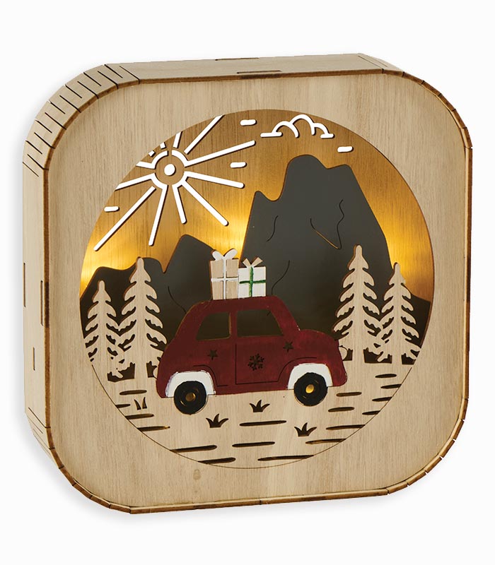 Cadre lumineux avec voiture transportant des cadeaux de Noël