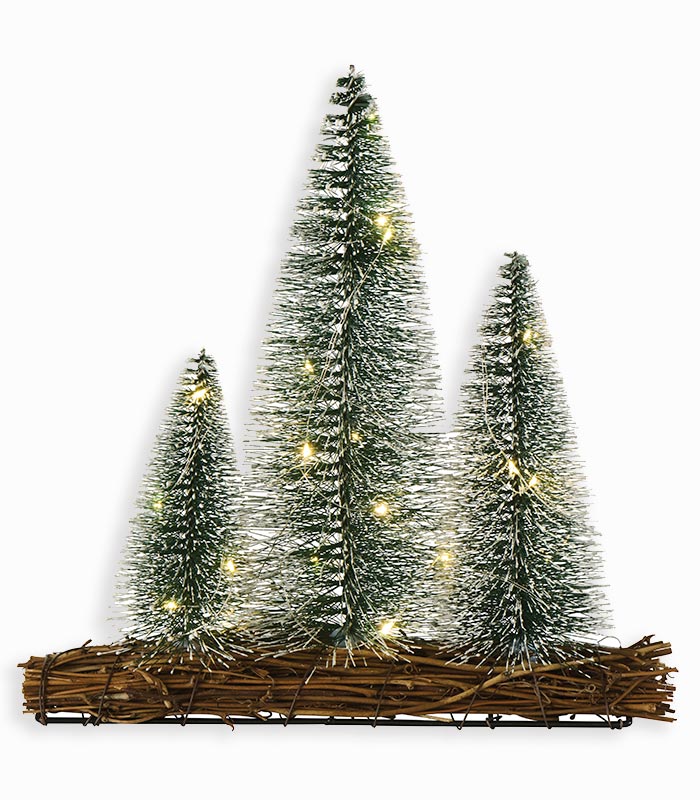 Décoration 3 sapins verts légèrement blanchi sur base en fagots avec éclairage 20 LED