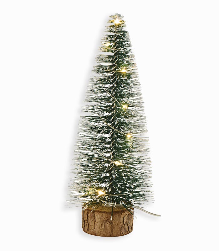 Décoration sapin vert légèrement blanchi sur base rond en bois avec éclairage 8 LED