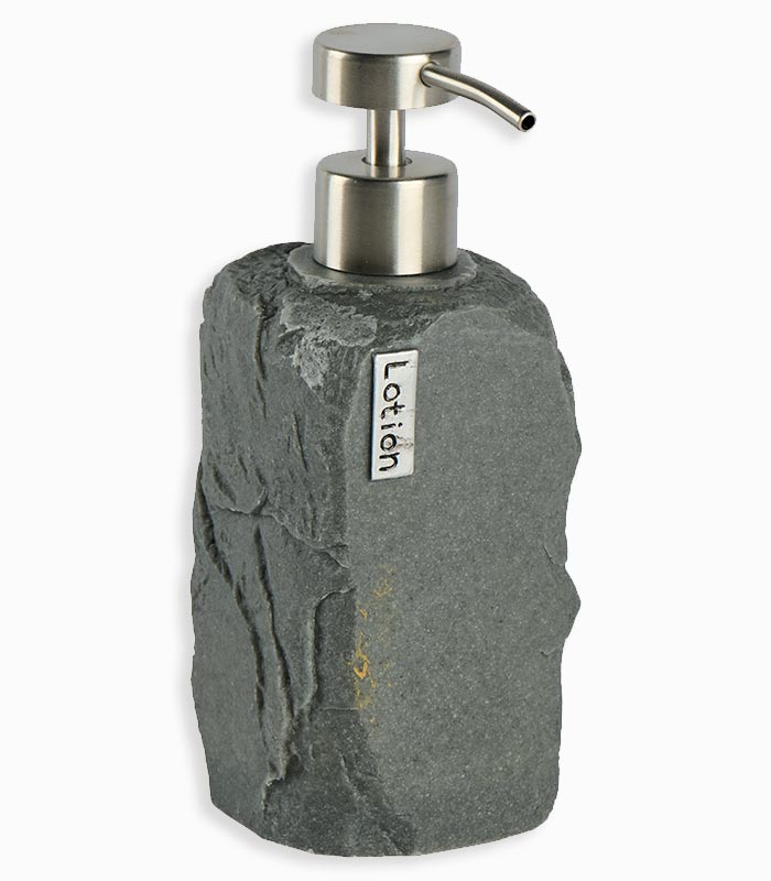 Distributeur de savon en résine imitation pierre grise et pompe en acier inoxydable.