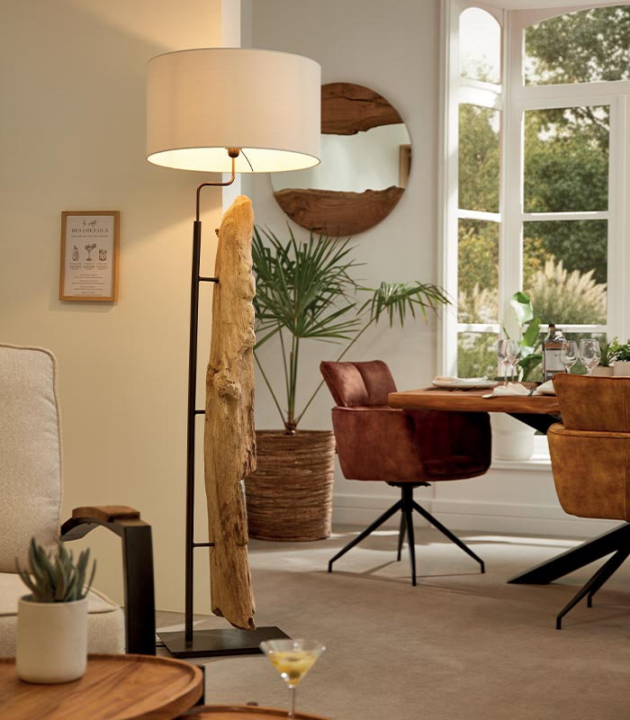 Lampadaire en teck recyclé finition naturelle et socle en métal noir.
