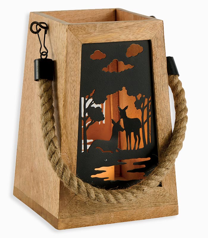 Lanterne trapèze en bois et métal noir ajouré motif cerfs