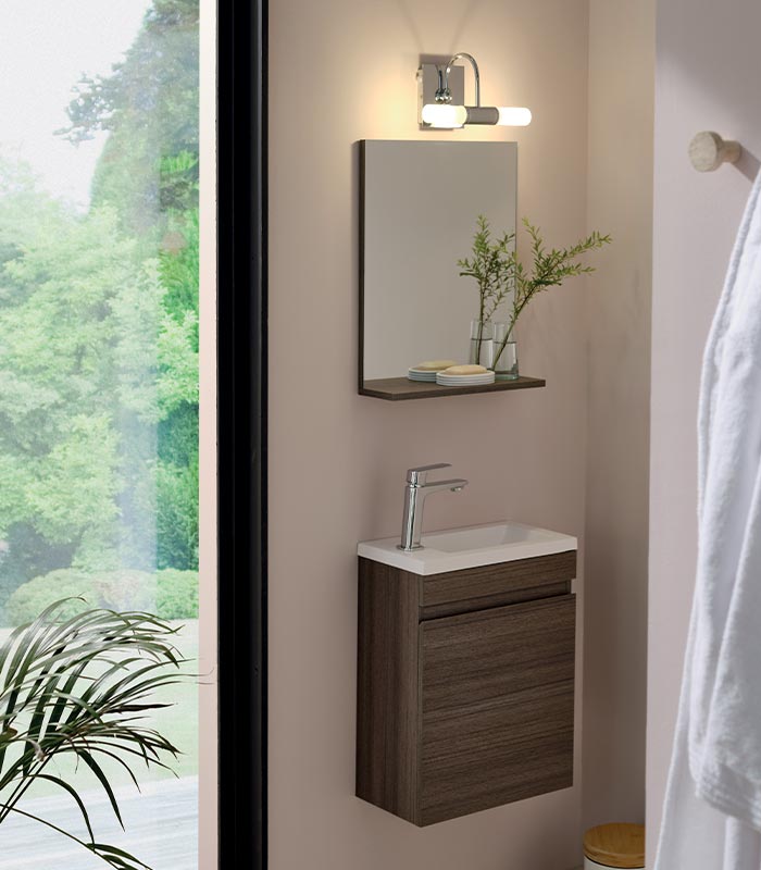 Lave mains de style contemporain avec miroir pour toilettes ou salle d'eau avec peu d'espace.