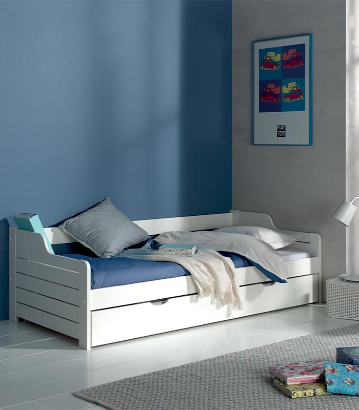 Le lit 1 place COSY VICKY en pin massif est pourvu d’un large tiroir avec un avec sommier à lattes, idéal pour recevoir des amis.