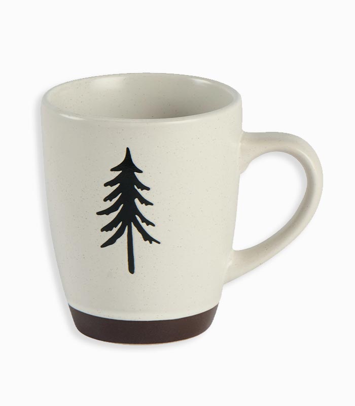 SMug en faïence écru, avec motif sapin noir sur fond écru, fond extérieur chocolat.