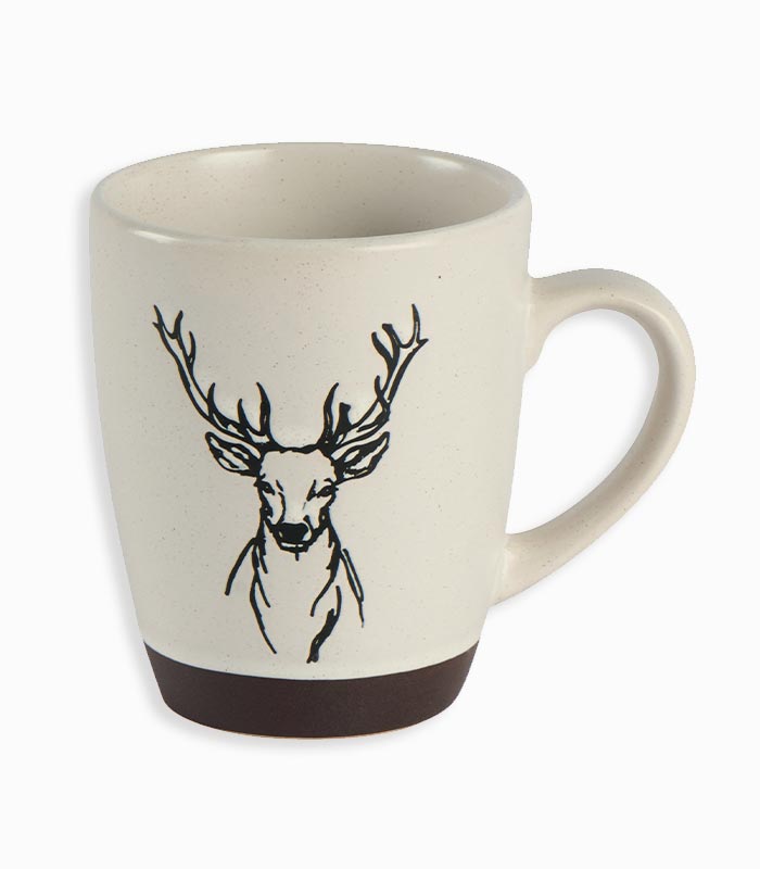 SMug en faïence écru, avec motif tête de cerf noire sur fond écru, fond extérieur chocolat.
