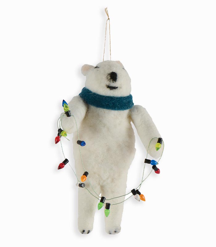 Figurine de Noël à suspendre, ours blanc avec écharpe bleue tenant une guirlande