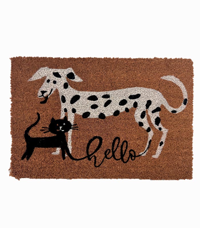 Paillasson en fibre de coco et PVC, coloris naturel avec chat noir et chien blanc.