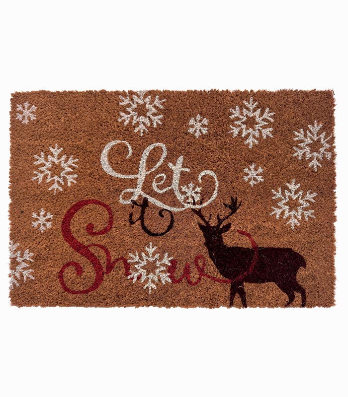Paillasson esprit Noël en fibre de coco et PVC, coloris naturel avec typo noir et rouge « Let it Snow », flocons blancs et cerf noir