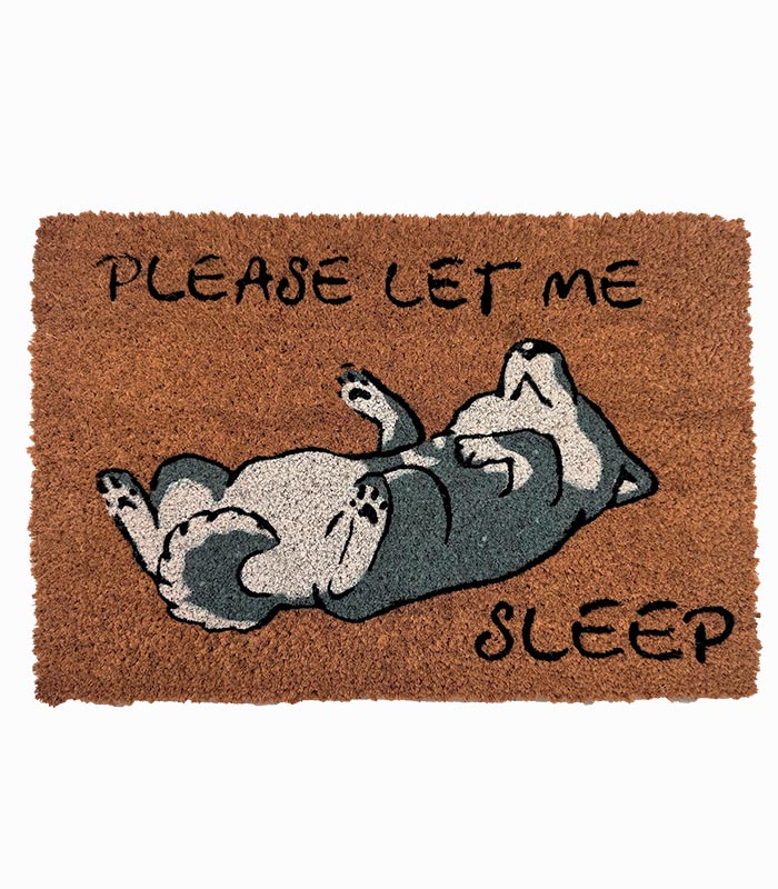 Paillasson en fibre de coco et PVC, coloris naturel avec chien des neiges se roulant à terre.