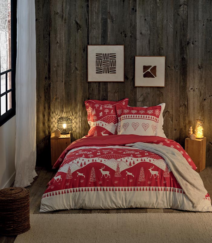 Plongez dans une ambiance feutrée avec ce linge de lit au style montagne.