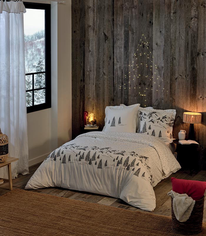 Plongez dans une ambiance feutrée avec ce linge de lit au style montagne.