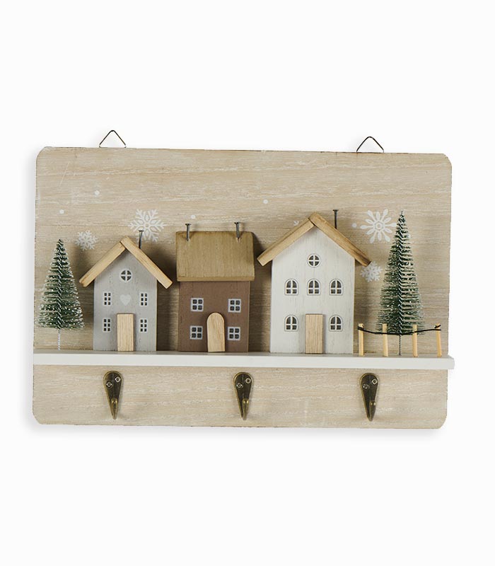 Patère murale en bois décor maisonnettes en bois gris/marron/blanc et sapins 3 crochets métal