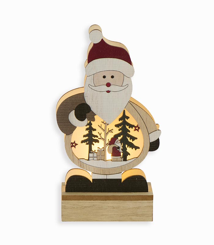 Père Noël en bois avec décor de Noël illuminé par une LED