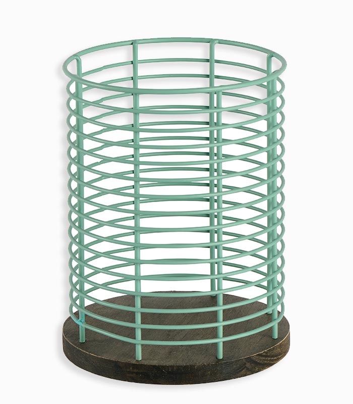 Porte-couverts vert amande en métal ajouré vert amande, base en bois.