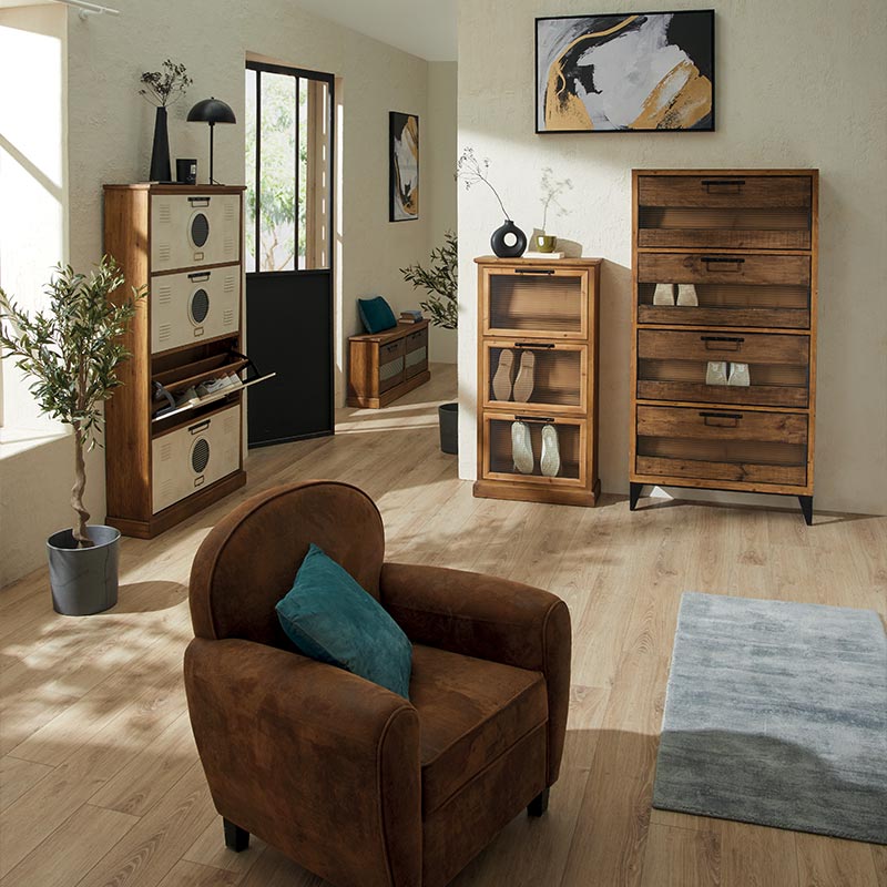 Craquez pour cette collection pleine de charme ! Avec son design résolument vintage, elle est idéale pour les intérieurs de type rétro ou industriel. Très fonctionnels, les meubles qui la composent offrent de multiples rangements.