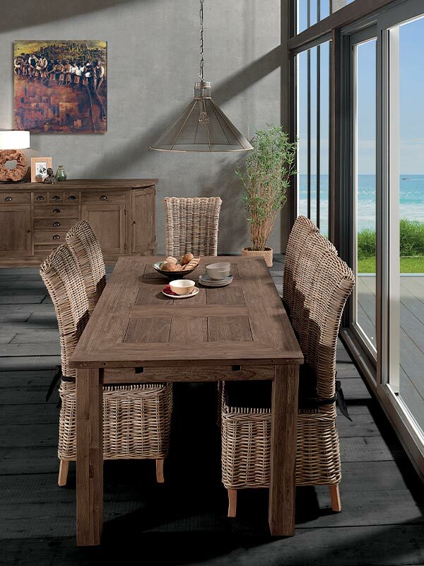 Le teck recyclé qui compose cette superbe collection de meubles de fabrication artisanale retrouve une seconde vie sous la main talentueuse des ébénistes.