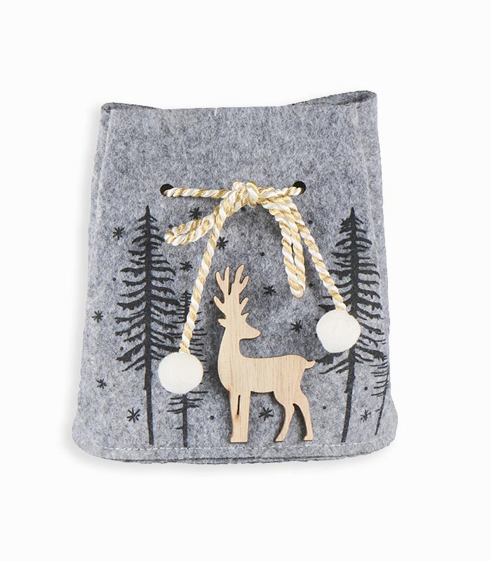 Sac en feutrine grise motif sapins et flocons noir avec cerf en bois découpé naturel, cordon avec pompons blancs