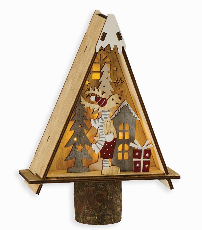 Sapin en bois avec décor de Noël illuminé par des LED