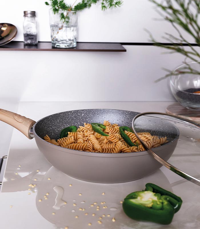 Sauteuse en aluminium forgé, anti adhésif PTFE multicouches effet marbre. Revêtement anti-adhésif et poignée en bakélite effet bois