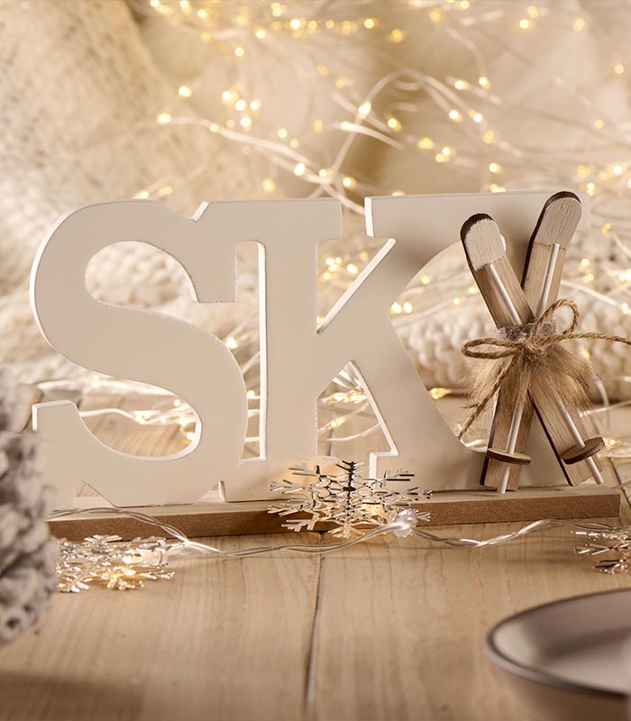 SKI en lettres en bois découpées à poser, avec paire de skis et bâtons