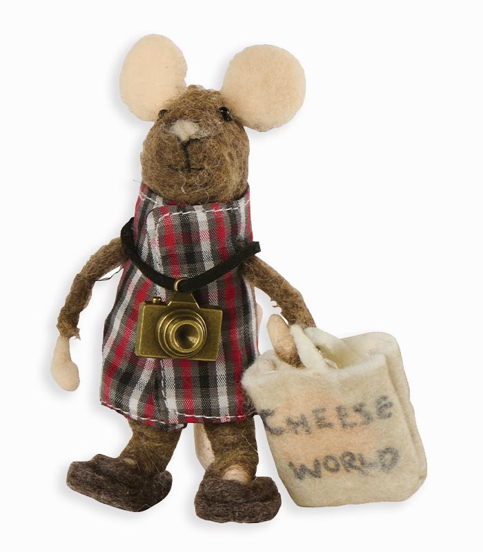 Figurine de Noël à suspendre, souris avec appareil photo et sac de course, gilet à carreaux rouge/noir/gris
