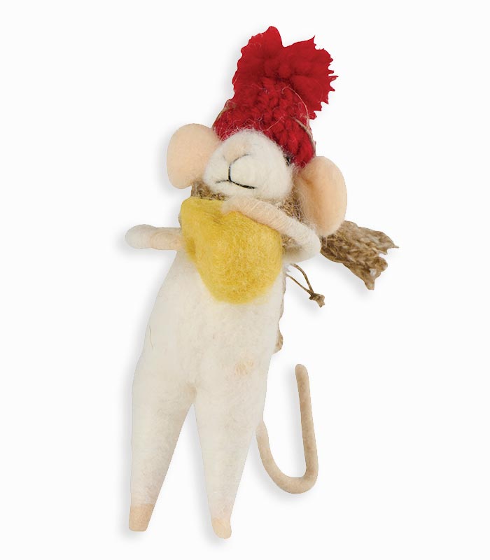 Figurine de Noël à suspendre, souris blanche avec bonnet rouge écharpe marron et morceau de fromage
