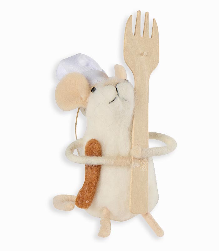 Figurine de Noël à suspendre, souris blanche cuisinier avec toque blanche tenant une cuillère et une baguette de pain
