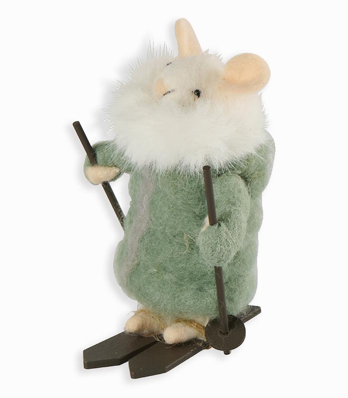 Figurine de Noël à suspendre, souris blanche skieuse avec manteau vert col fourrure blanche, skis et bâton