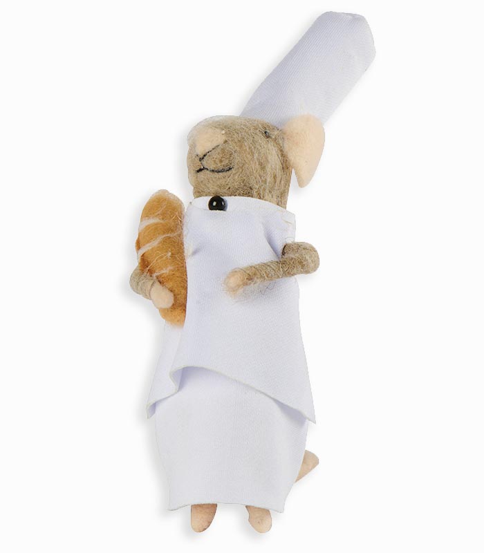 Figurine de Noël à suspendre, souris grise boulanger avec toque et blouse blanche tenant son pain