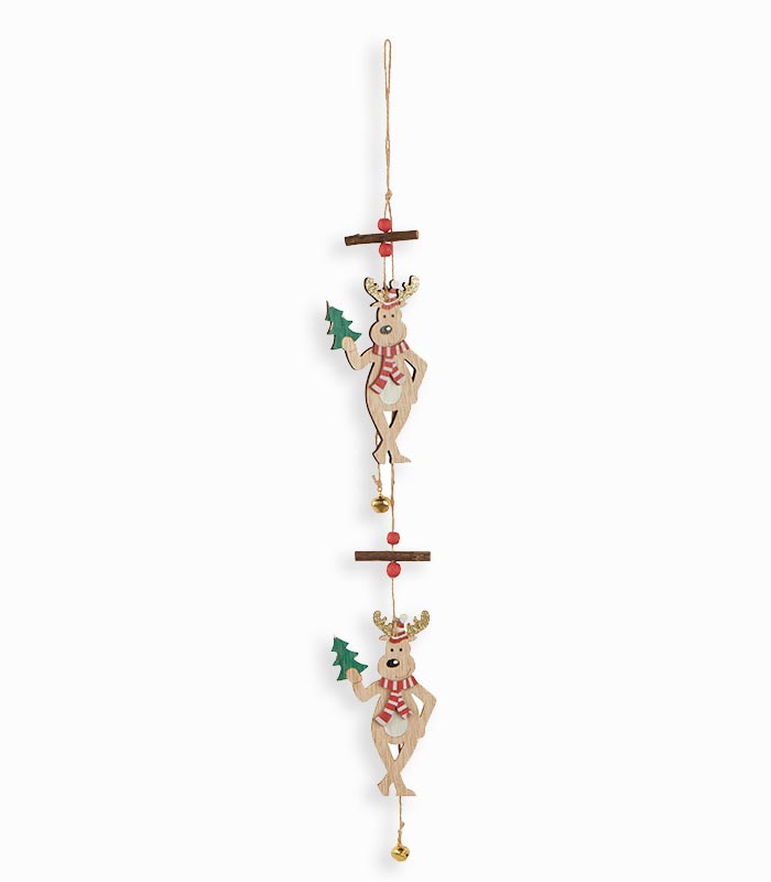 Suspension 2 rennes en bois tenant un sapin en bois naturel/rouge/vert, cornes pailletées dorées, clochettes dorées