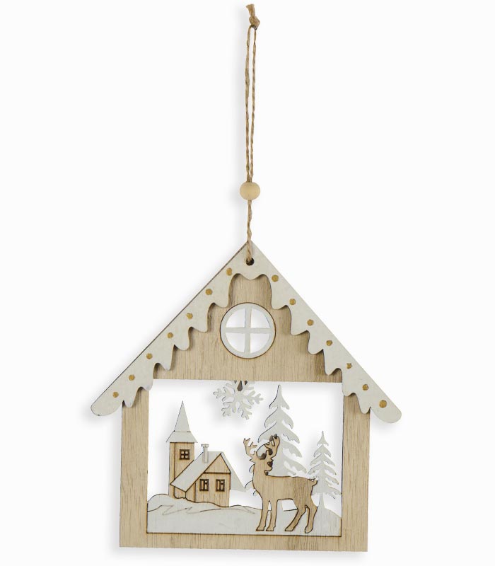 Suspension chalet en bois naturel et blanc décor ajouré cerf/sapins/chalet