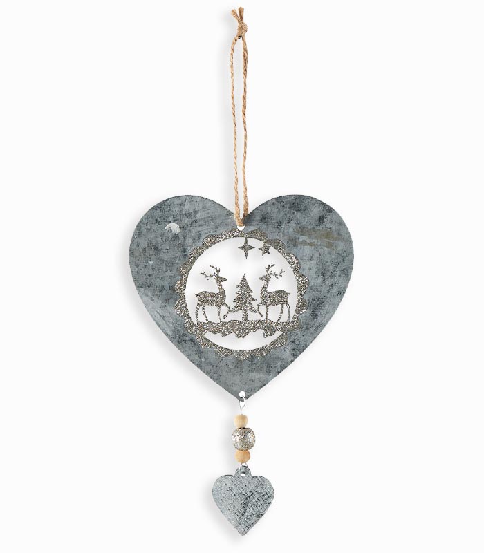 Suspension en forme de coeur gris et argenté en métal ajouré décor cerfs et sapin avec cœur en suspension