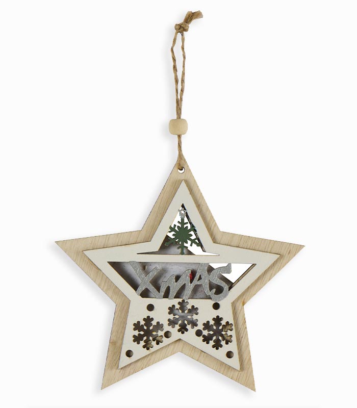 Etoile à suspendre en bois naturel et vert foncé, décor ajouré flocons et « Xmas »